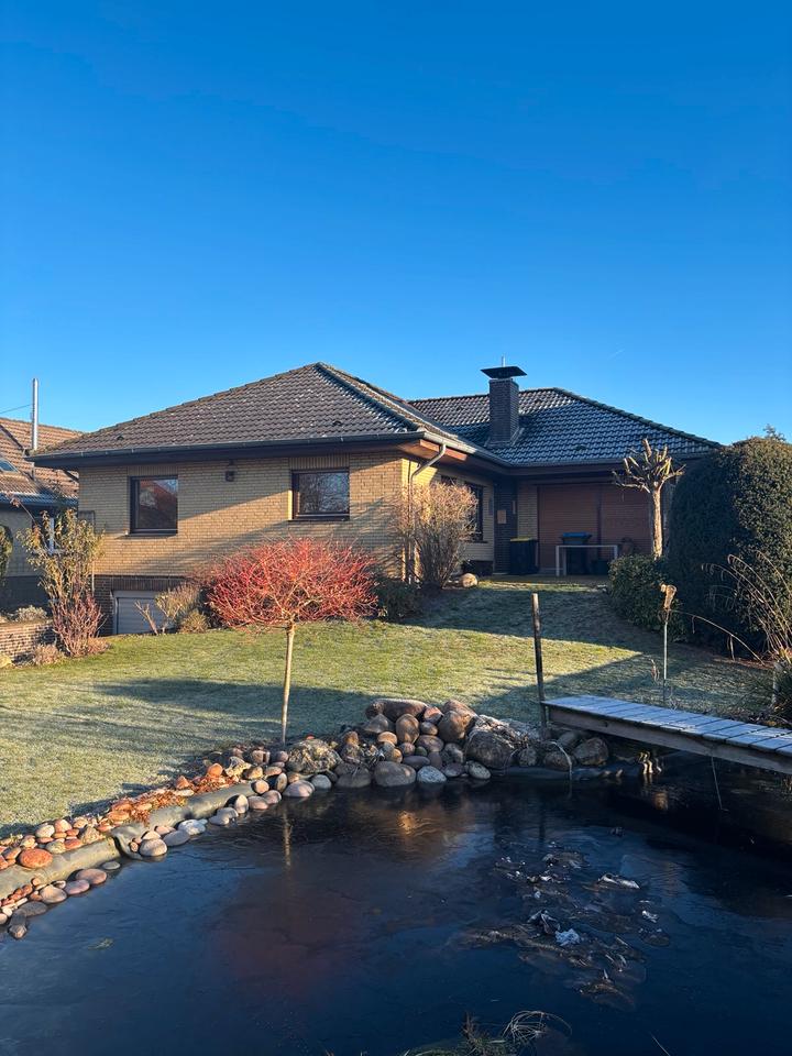 Zur Vermietung steht ein unterkellerter Winkelbungalow auf einem großen Grundstück.